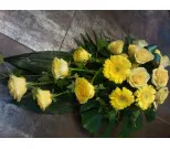 Begravningsarrangemang med gula germini och gula rosor.