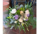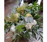 Vacker spretig bukett med vitt, grönt och litet blått/violett. Av säsonges blommor.