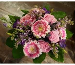 Låg bunden bukett i mörkrosa nyanser av säsongens blommor.