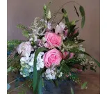 Låg bukett i ljusrosa och vita toner av säsongens blommor.