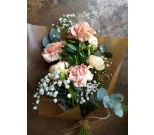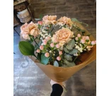 Trendig bukett i vaxpapper av säsongens blommor.