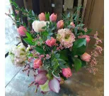 Tulpan med andra snittblommor. Snittblommor och färger varierar med säsong.