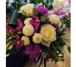 Låg bukett med vit och violet toner. Av säsongens blommor.