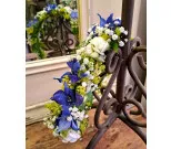 Krans med blå riddarsporre, slöjblomma och eustoma.