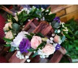 Krans med ros, eustoma, slöjblomma och hortensia. Av säsongens blommor.