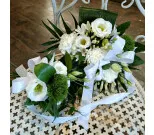 Mamma-barn-bukett med vitgröna toner av säsongens blommor.