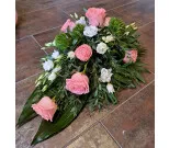 Begravningsarrangemang med ljusröd ros, vit eustoma och grön nejlika.