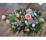 Begravningsarrangemang med ljusrosa ros, clematis, astilbe, kvistnejlika och slöjblomma.