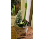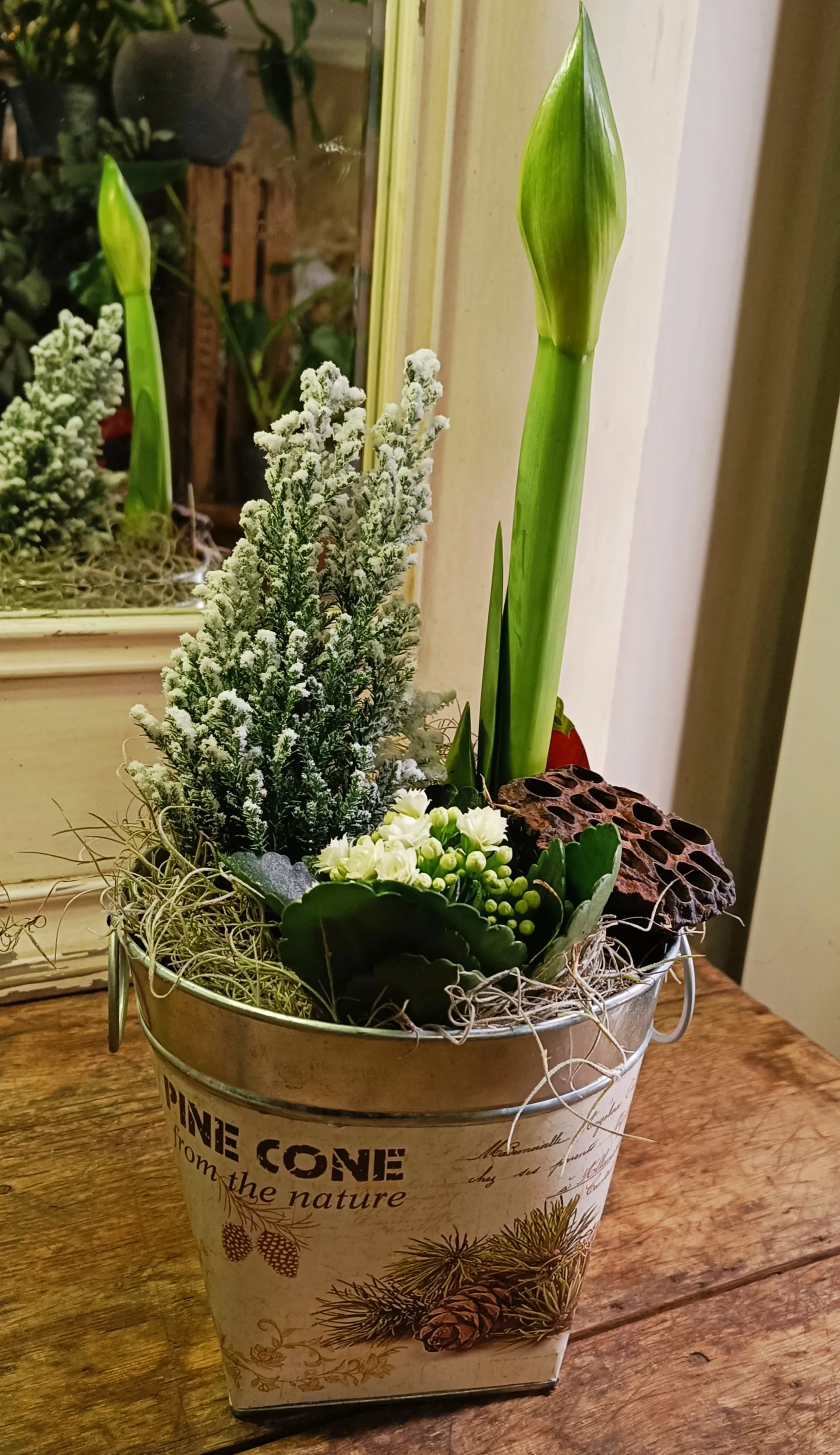 Istutus jossa amaryllis, sypressi ja tulilatva. Tulilatvan väri voi vaihdella punaisen ja valkoisen välillä.
