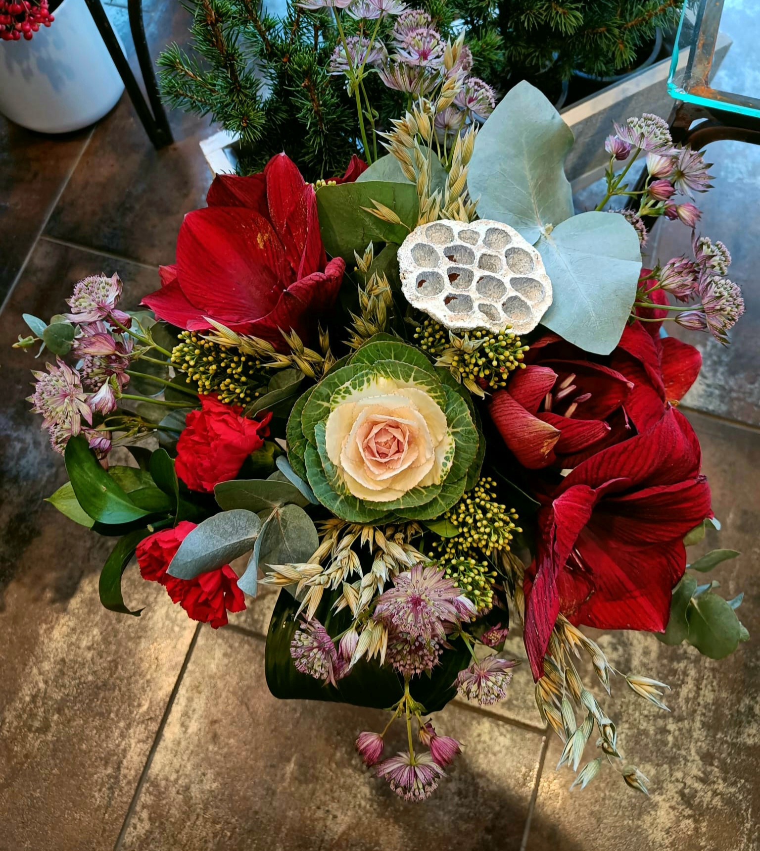 Kaunis jouluinen kimppu! Valitse haluamasi pääväri. Kuvan kimppu koossa M.