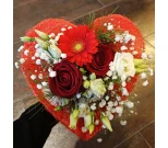 Sydänpohjaan sidottu kimppu - päävärinä valkoinen kauden kukista.
