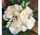 Matala kimppu valkoisesta ruususta sekä eustomasta.