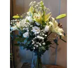 Korkea kimppu valkoisista kauden kukista. Kuvan kimpussa harsoa, liljaa ja eustomaa.