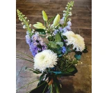 Korkea kimppu valkoisen ja sinisen/violetin sävyissä kauden kukista.