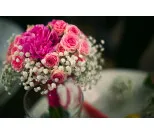 Tuotteet Morsiussidonta Pyöreä hääkimppu Neilikka, oksaruusu ja harsokukka Neilikka, oksaruusu ja harsokukka