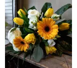Kelta-valkoinen pääsiäiskimppu kauden kukista.