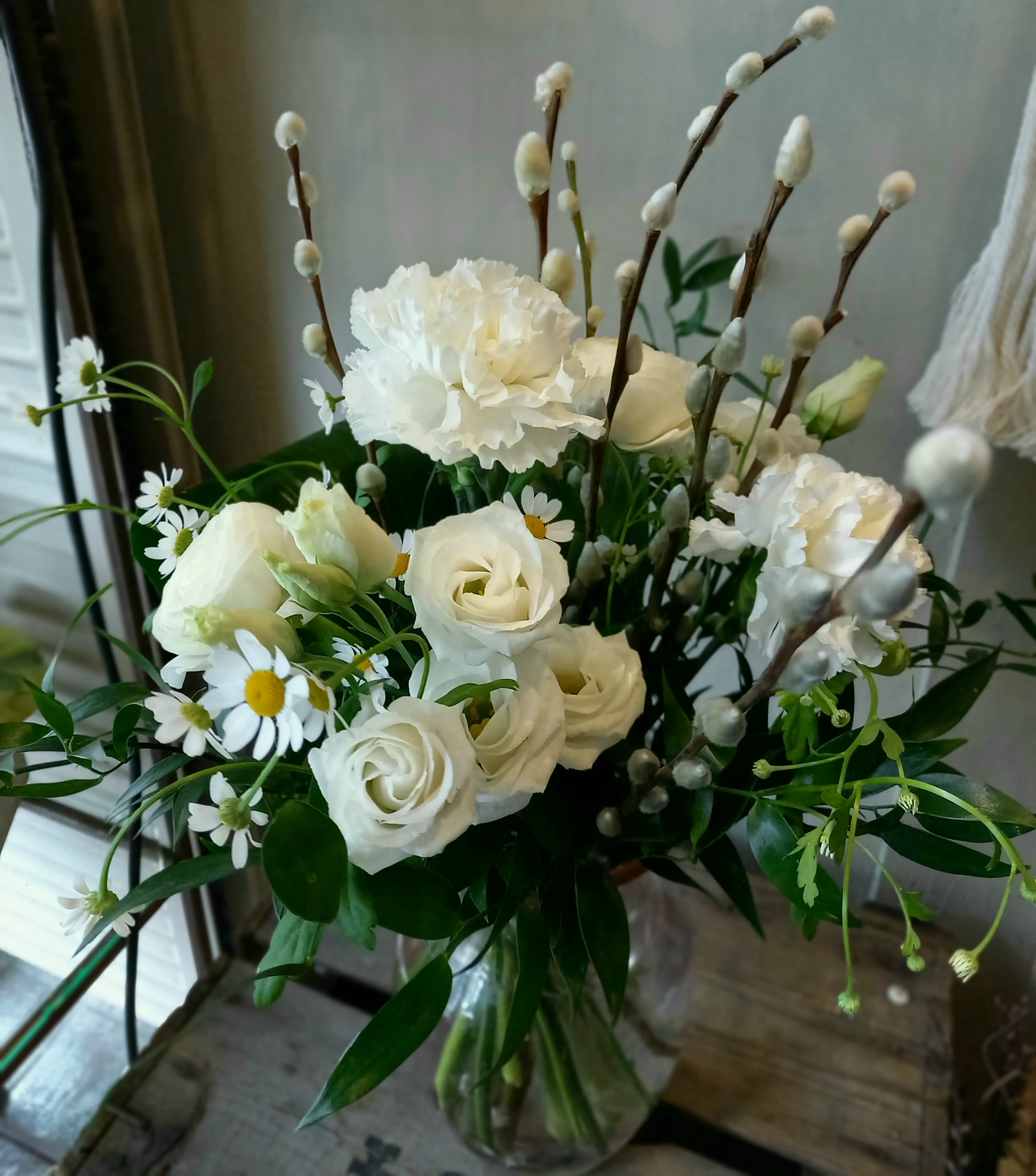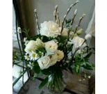 Valkoinen pääsiäiskimppu kauden kukista.