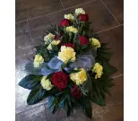 Hautavihko jossa keltaista neilikkaa sekä punaista ruusua.