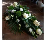 Hautavihko jossa valkoista ruusua, vihreää neilikkaa ja valkoista eustomaa.