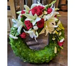 Seppele salal pohjalla valkoisesta liljasta, punaisesta ruususta ja valkoisesta oksaneilikasta.