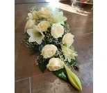 Hautavihko valkoisesta liljasta, valkoisesta ruususta ja harsosta.