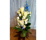 Surukimppu valkoisesta liljasta, sinisesta ritarinkannusta ja valkoisesta eustomasta.