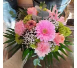 Hempeä kimppu - hempeän värisistä kauden kukista vaaleanpunaisen rusetin kanssa.